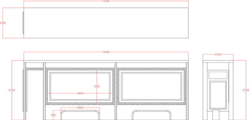 此款仿古候車亭CA-1056主體采用鍍鋅鋼結(jié)構(gòu),表面采用氟碳金屬烤漆工藝,視窗面板采用鋼化玻璃,燈箱內(nèi)置LED燈。具有外形美觀、表面耐腐蝕、抗風(fēng)性能強(qiáng)、使用壽命長(zhǎng)等優(yōu)點(diǎn)。產(chǎn)品的樣式、尺寸、顏色、材質(zhì)、配置等均可按需定制。